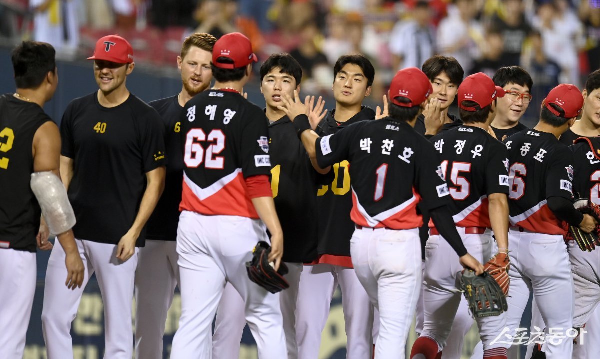 18일 서울 잠실야구장에서 ‘2024 신한은행 SOL뱅크 KBO리그’ KIA 타이거즈와 LG 트윈스 경기가 열렸다. 4-0 승리를 거두며 LG전 스윕을 거둔 KIA 선수들이 하이파이브 하고 있다. 잠실|김종원 기자 won@donga.com