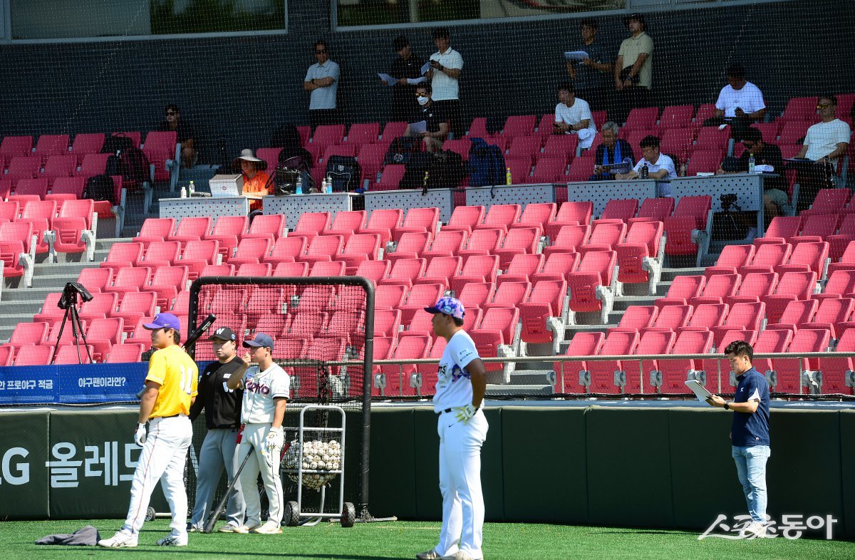 19일 경기도 이천시 LG챔피언스파크에서 ‘2025 KBO 신인 드래프트 트라이아웃’이 열렸다. 10개 구단 스카우터들이 트라이아웃을 지켜보고 있다. 이천 | 김민성 기자 marineboy@donga.com