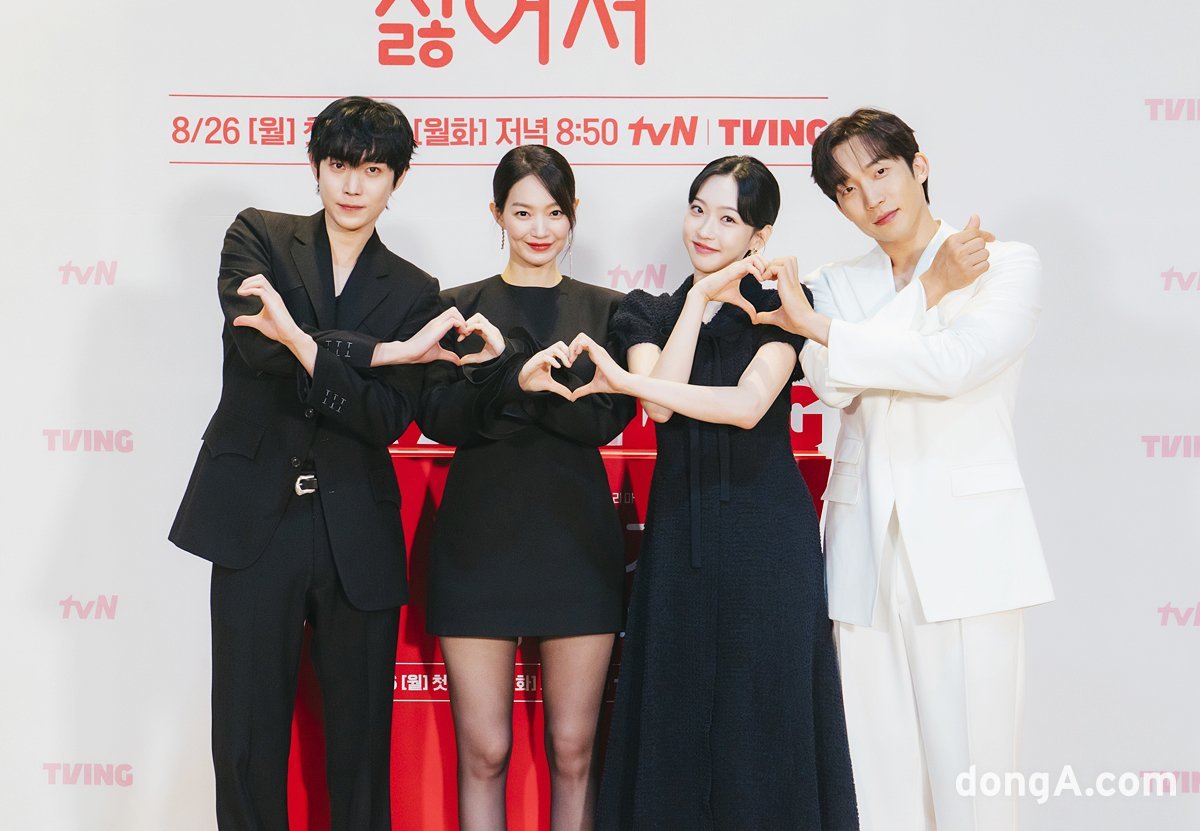 신민아, 김영대, 이상이, 한지현이 19일 오후 진행된 tvN X TVING 오리지널 드라마 ‘손해 보기 싫어서’ 제작발표회에서 포즈를 취하고 있다.