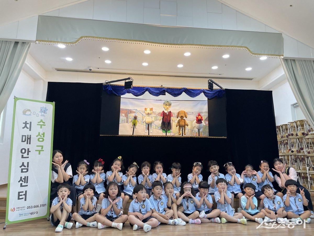 어린이 치매인식개선 인형극을 관람하고 기념촬영을 하고 있다./사진=수성구