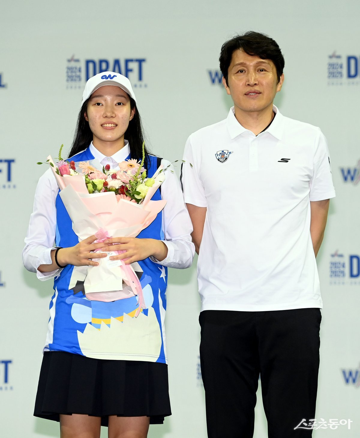 20일 경기도 부천체육관에서 ‘2024-2025 WKBL 신인선수 드래프트’가 열렸다. 이민지가 6순위로 우리은행에 지명된 후 위성우 감독과 기념촬영을 하고 있다. 부천 | 김민성 기자 marineboy@donga.com