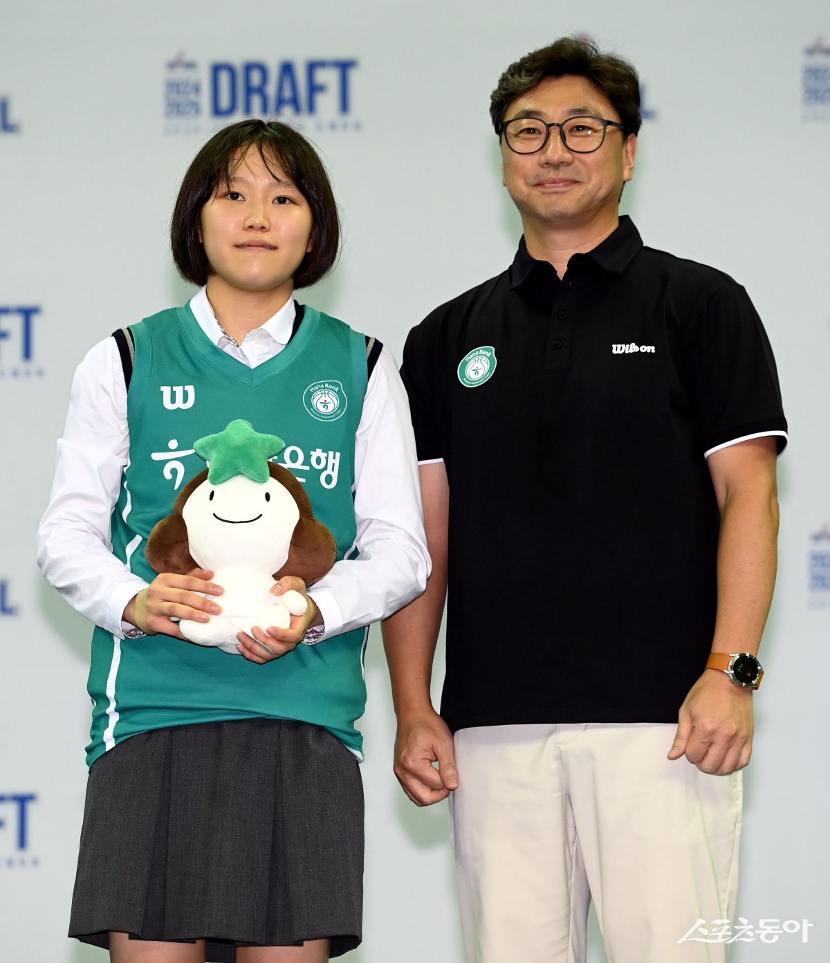 20일 경기도 부천체육관에서 ‘2024-2025 WKBL 신인선수 드래프트’가 열렸다. 하지윤이 2라운드 4순위로 하나은행에 지명된 후 김도완 감독과 기념촬영을 하고 있다. 부천 | 김민성 기자 marineboy@donga.com
