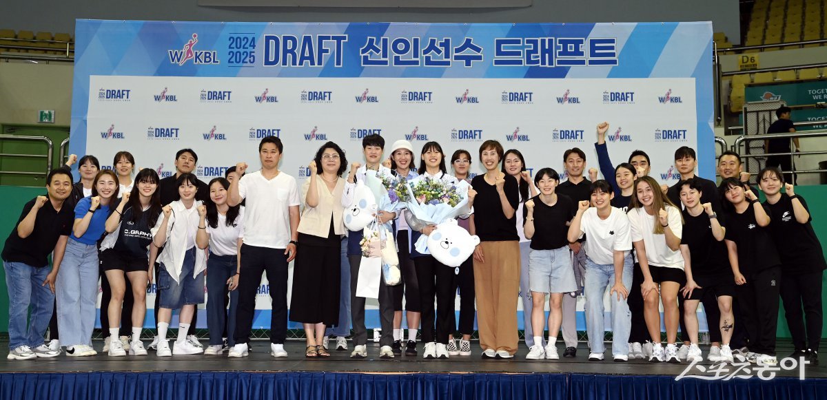 20일 경기도 부천체육관에서 ‘2024-2025 WKBL 신인선수 드래프트’가 열렸다. 신한은행 여자농구 선수들이 신한은행에 지명된 1순위 홍유순, 11순위 김채은을 축하하고 있다. 부천 | 김민성 기자 marineboy@donga.com