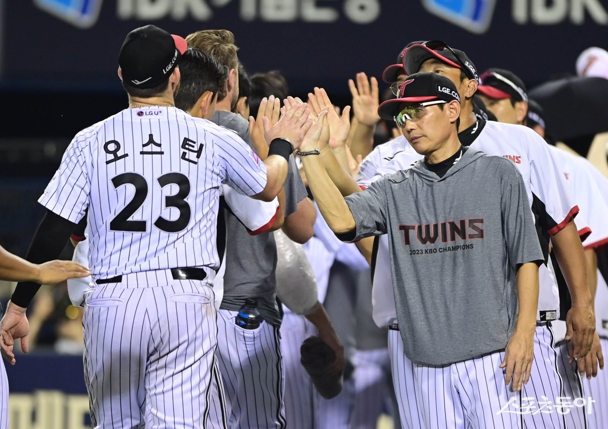 20일 서울 잠실야구장에서 열린 ‘2024 신한 SOL 뱅크 KBO리그’ SSG 랜더스와 LG 트윈스의 경기에서 4-3으로 승리한 LG 염경엽 감독이 선수들과 기쁨을 나누고 있다. 잠실 | 주현희 기자 teth1147@donga.com