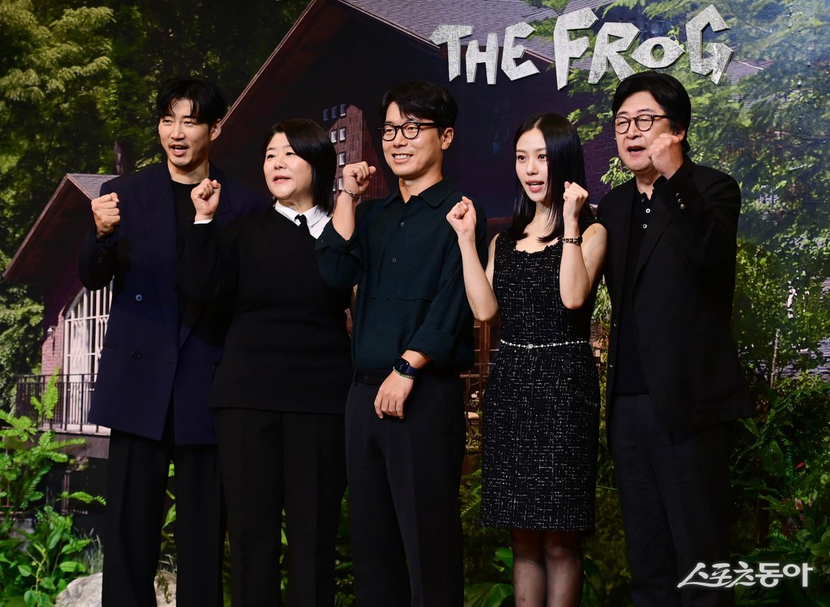 배우 윤계상, 이정은, 모완일 감독, 고민시, 김윤석이 21일 서울 강남구 조선팰리스 강남에서 열린 넷플릭스 시리즈 ‘아무도 없는 숲속에서’ 제작발표회에서 포즈를 취하고 있다. 주현희 기자 teth1147@donga.com