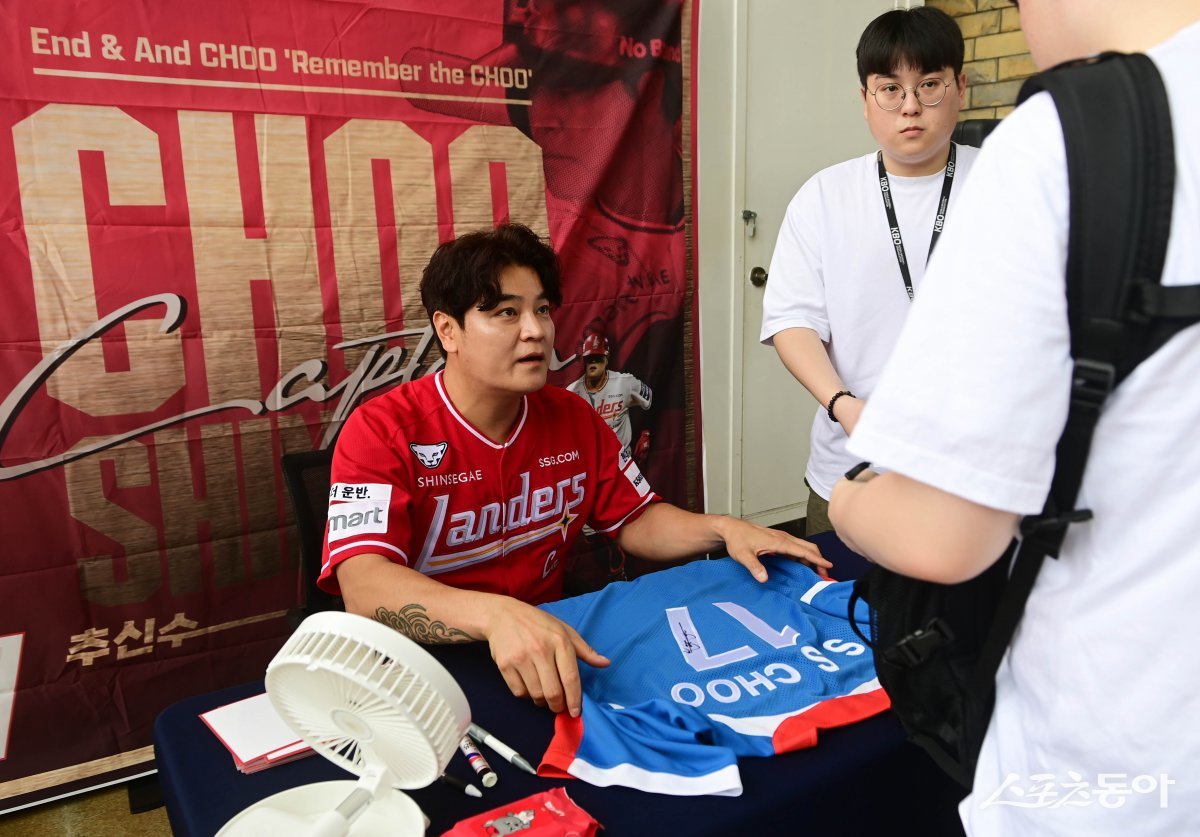 21일 서울 잠실야구장에서 열린 ‘2024 신한 SOL 뱅크 KBO리그’ SSG 랜더스와 LG 트윈스의 경기에 앞서 SSG 추신수가 전구장 은퇴 기념 사인회를 하고 있다. 잠실 | 주현희 기자 teth1147@donga.com