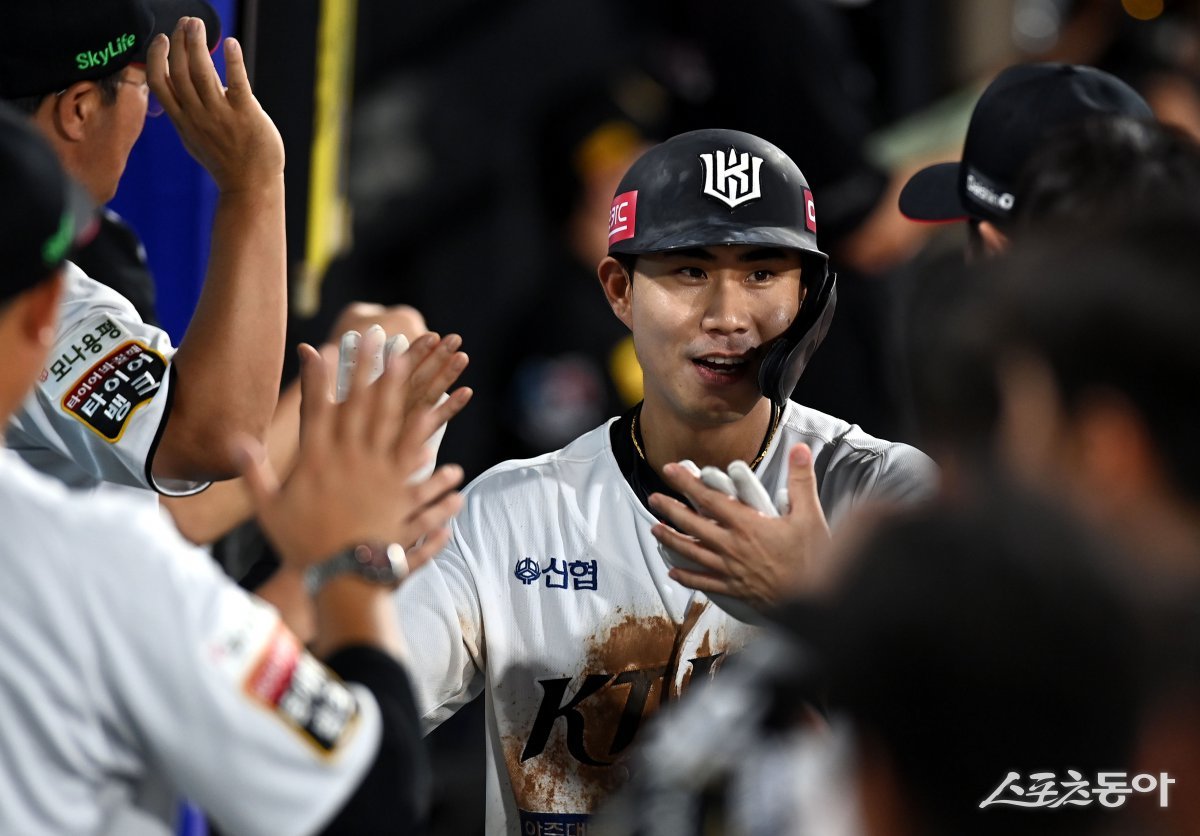 21일 경기도 수원 KT위즈파크에서 ‘2024 신한 SOL 뱅크 KBO리그’ KT 위즈와 키움 히어로즈의 경기가 열렸다. 5회말 2사 1루에서 KT 심우준이 투런 홈런을 쏘아 올린 후 동료들의 환영을 받고 있다. 수원 | 김민성 기자 marineboy@donga.com