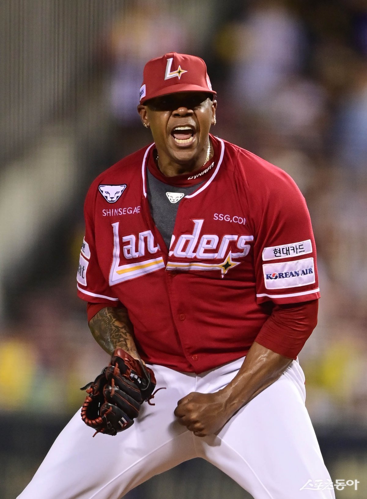 21일 서울 잠실야구장에서 열린 ‘2024 신한 SOL 뱅크 KBO리그’ SSG 랜더스와 LG 트윈스의 경기에서 7회말 무실점으로 수비를 마친 SSG 엘리아스가 포효하고 있다. 잠실 | 주현희 기자 teth1147@donga.com