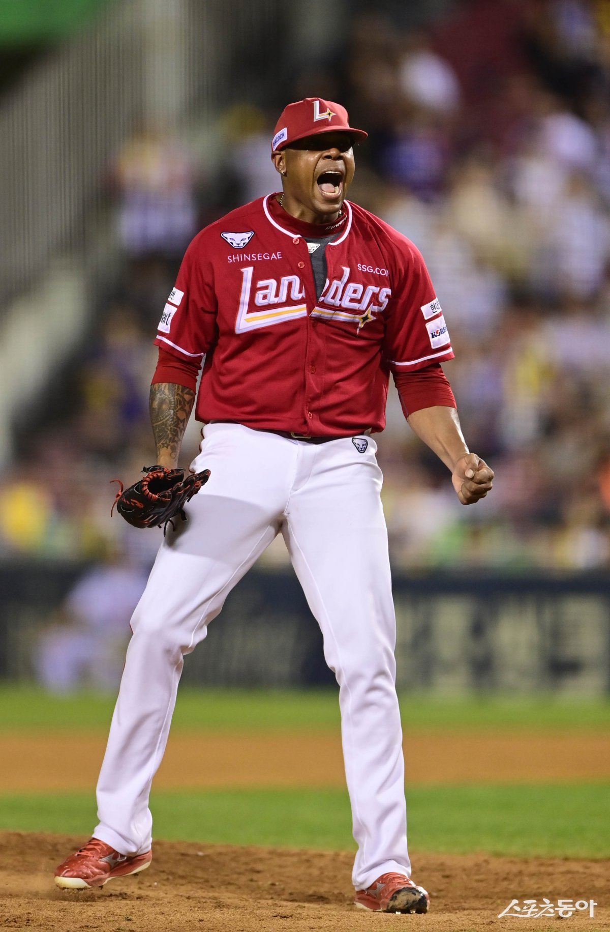 21일 서울 잠실야구장에서 열린 ‘2024 신한 SOL 뱅크 KBO리그’ SSG 랜더스와 LG 트윈스의 경기에서 7회말 무실점으로 수비를 마친 SSG 엘리아스가 포효하고 있다. 잠실 | 주현희 기자 teth1147@donga.com