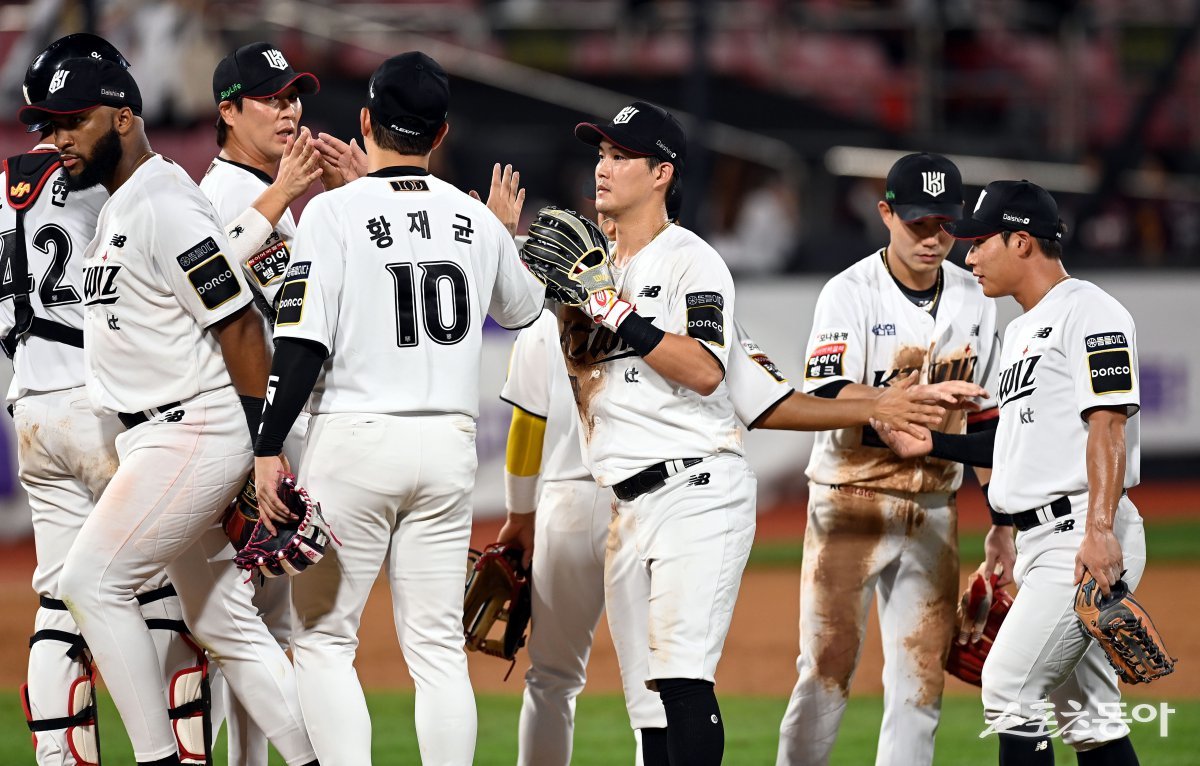 21일 경기도 수원 KT위즈파크에서 ‘2024 신한 SOL 뱅크 KBO리그’ KT 위즈와 키움 히어로즈의 경기가 열렸다. KT가 키움을 상대로 5-0 승리를 거둔 후 선수들이 그라운드에서 기쁨을 나누고 있다. 수원 | 김민성 기자 marineboy@donga.com