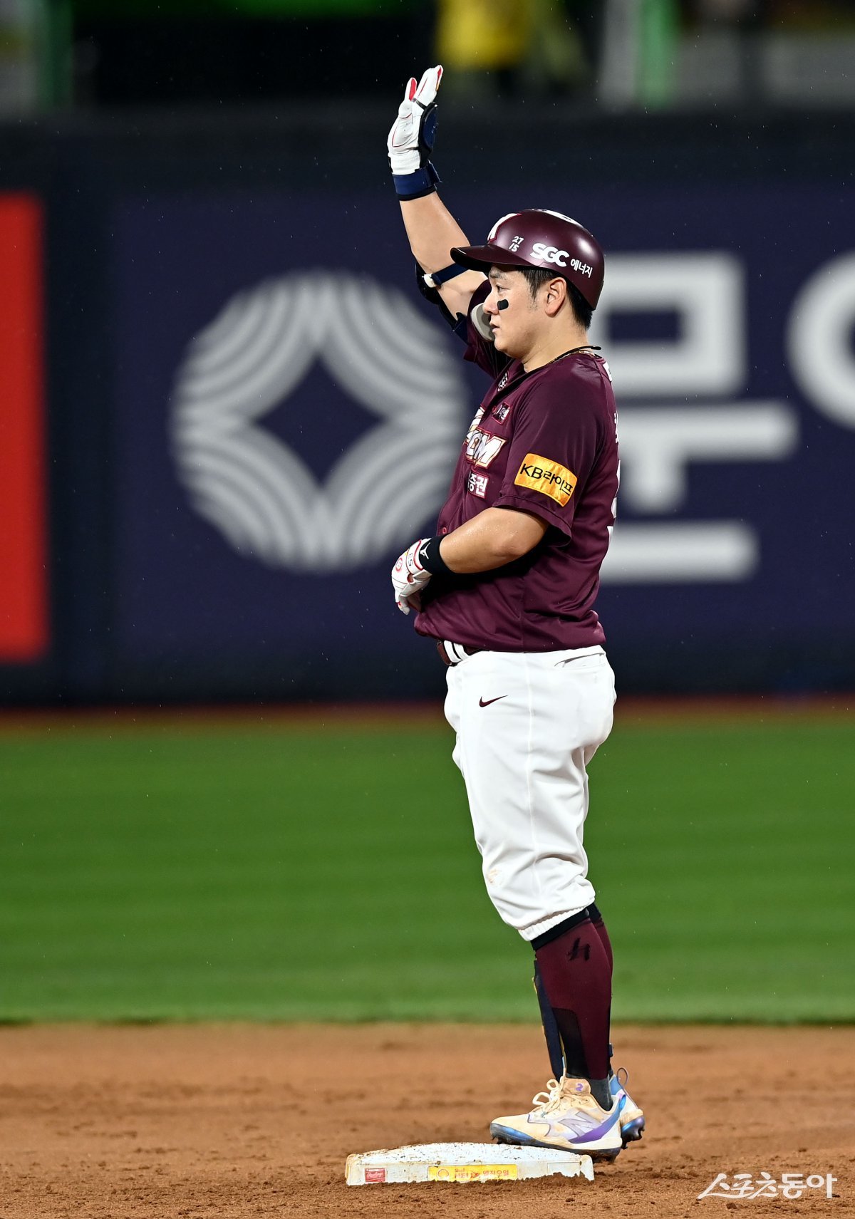 22일 경기도 수원 KT위즈파크에서 ‘2024 신한 SOL 뱅크 KBO리그’ KT 위즈와 키움 히어로즈의 경기가 열렸다. 4회초 1사 2루에서 키움 최주환이 1타점 2루타를 날린 후 환호하고 있다. 수원 | 김민성 기자 marineboy@donga.com