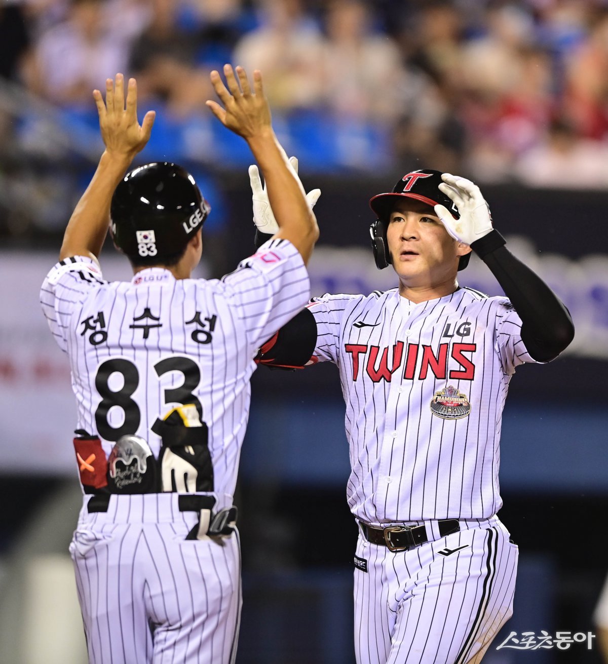 22일 서울 잠실야구장에서 열린 ‘2024 신한 SOL 뱅크 KBO리그’ SSG 랜더스와 LG 트윈스의 경기에서 4회말 2사 1루 LG 오지환이 좌월 2점 홈런을 친 후 1루코치와 기쁨을 나누고 있다. 잠실 | 주현희 기자 teth1147@donga.com