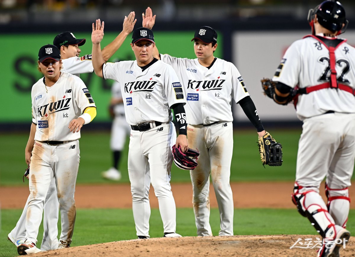 22일 경기도 수원 KT위즈파크에서 ‘2024 신한 SOL 뱅크 KBO리그’ KT 위즈와 키움 히어로즈의 경기가 열렸다. KT가 키움을 상대로 3-2 승리하며 2연승을 거둔 후 선수들이 그라운드에서 기쁨을 나누고 있다. 수원 | 김민성 기자 marineboy@donga.com