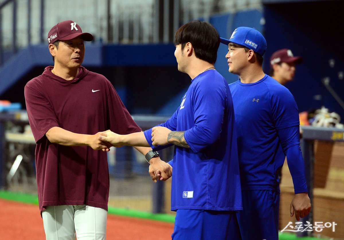 27일 서울 고척 스카이돔에서 ‘2024 신한 SOL 뱅크 KBO리그’ 키움 히어로즈와 삼성 라이온즈의 경기가 열린다. 경기 전 키움 홍원기 감독이 삼성 박병호, 전병우와 인사를 나누고 있다. 고척 | 김민성 기자 marineboy@donga.com