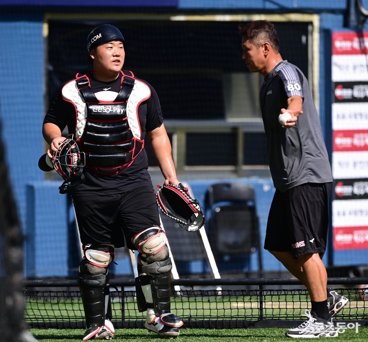 28일 서울 잠실야구장에서 열린 ‘2024 신한 SOL 뱅크 KBO리그’ KT 위즈와 LG 트윈스의 경기에 앞서 LG 김범석이 박경완 코치와 이야기를 하고 있다. 잠실 | 주현희 기자 teth1147@donga.com