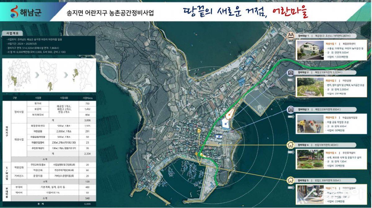 전남 해남군이 농식품부가 주관한 2024년 농촌공간정비사업 2차 공모에 송지면 어란지구가 선정되어 국비 30억원을 포함해 총 60억원 사업비를 확보했다.