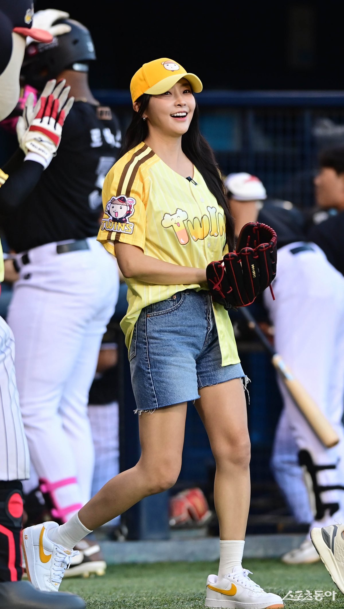 29일 서울 잠실야구장에서 열린 ‘2024 신한 SOL 뱅크 KBO리그’ KT 위즈와 LG 트윈스의 경기에 앞서 시구자 배우 정유미가 그라운드에 입장하고 있다. 잠실 | 주현희 기자 teth1147@donga.com