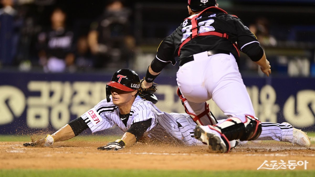 29일 서울 잠실야구장에서 열린 ‘2024 신한 SOL 뱅크 KBO리그’ KT 위즈와 LG 트윈스의 경기에서 4회말 1사 1, 3루 LG의 땅볼 때 3루주자 이영빈이 홈으로 파고들어 세이프 되고 있다. 잠실 | 주현희 기자 teth1147@donga.com