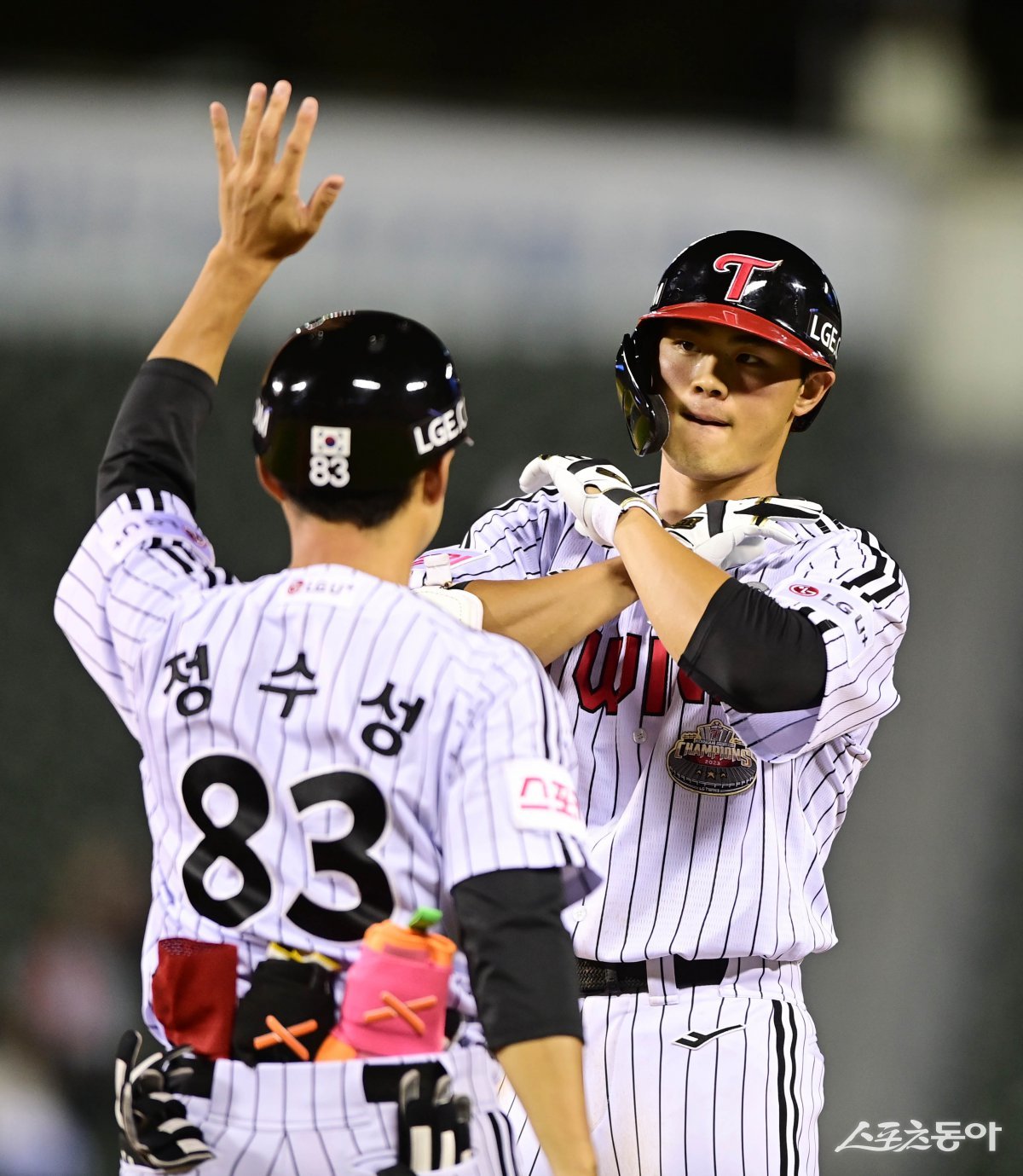 29일 서울 잠실야구장에서 열린 ‘2024 신한 SOL 뱅크 KBO리그’ KT 위즈와 LG 트윈스의 경기에서 4회말 1사 2루 LG 이영빈이 역전 1타점 중전 적시타를 친 후 세리머니를 하고 있다. 잠실 | 주현희 기자 teth1147@donga.com