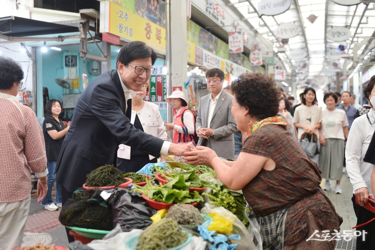 박형준 시장이 추석 명절을 앞둔 지난 3일 수영팔도시장을 찾아 상인을 격려하고 있다. (사진제공=부산시)