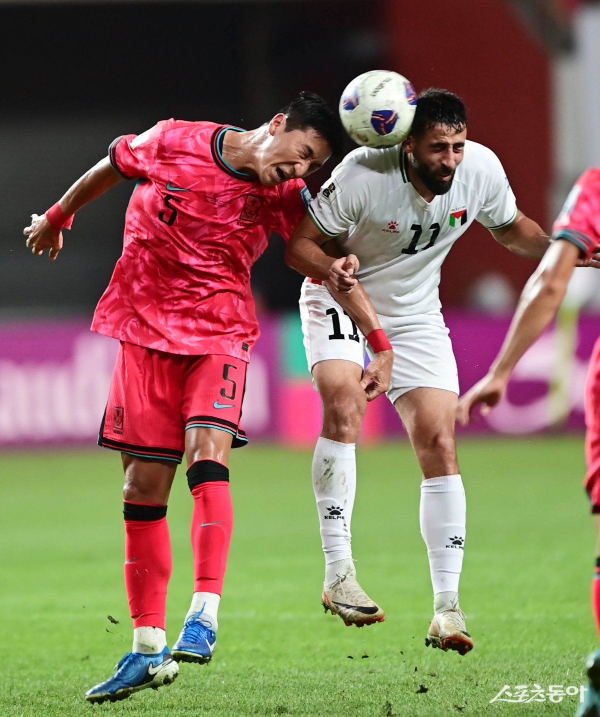 5일 서울월드컵경기장에서 열린 ‘2026 FIFA 북중미 월드컵’ 3차 예선 한국과 팔레스타인의 경기에서 한국 정우영이 팔레스타인 수비수와 헤딩 경합을 하고 있다. 상암 | 주현희 기자 teth1147@donga.com