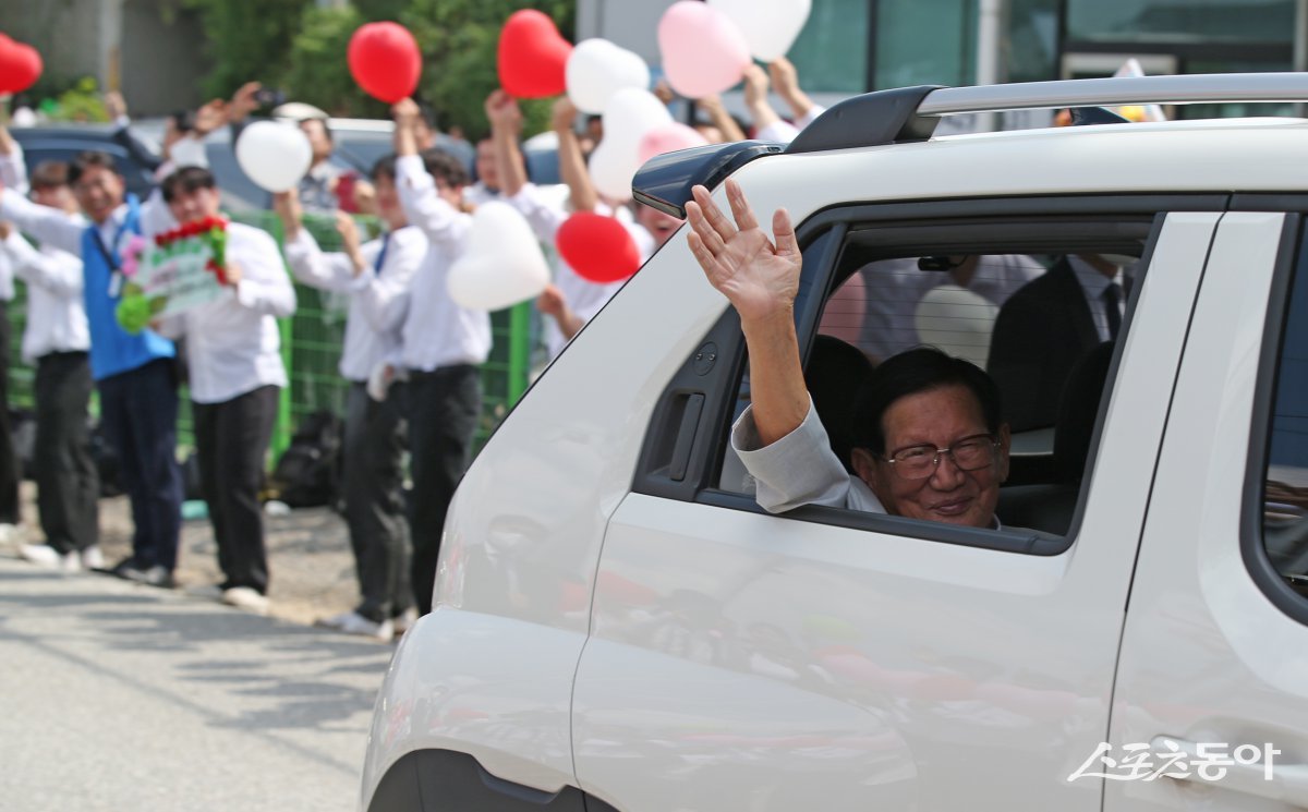 신천지예수교 증거장막성전(신천지예수교회, 총회장 이만희)이 8일 맛디아지파 지교회인 청주교회에서 주일 예배를 진행한 가운데 청주교회로 입장하는 이만희 총회장이 환영하는 성도들을 향해 손을 흔들며 환영에 답하고 있다.