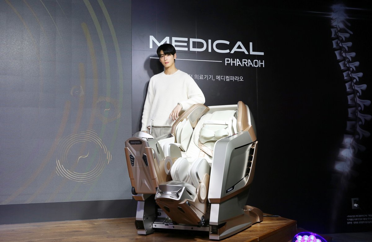 바디프랜드가 ‘메디컬 안마의자’를 통해 홈 헬스케어 기기를 강화한다. 론칭 컨퍼런스에서 신제품 ‘메디컬파라오’와 포즈를 취하고 있는 모델 차은우(위)와 인사말을 하고 있는 지성규 바디프랜드 총괄부회장. 사진제공|바디프랜드