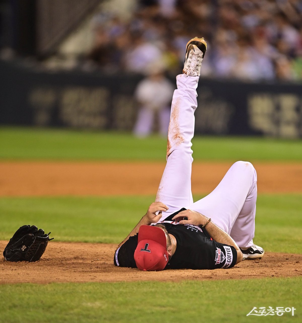 19일 서울 잠실야구장에서 열린 ‘2024 신한 SOL 뱅크 KBO리그’ KIA 타이거즈와 두산 베어스의 경기에서 2회말 2사 2루 두산에 볼넷을 허용한 직후 KIA 스타우트가 마운드에 쓰러져있다. 잠실 | 주현희 기자 teth1147@donga.com