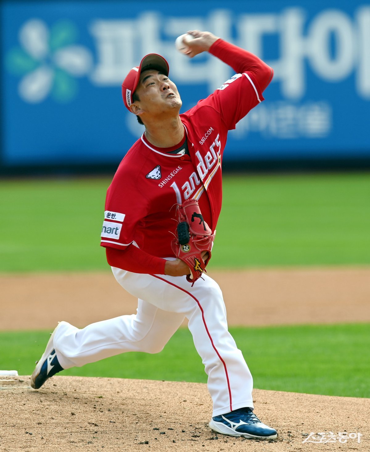 22일 경기도 수원KT위즈파크에서 ‘2024 신한 SOL 뱅크 KBO리그’ KT 위즈와 SSG 랜더스의 경기가 열렸다. SSG 선발투수 김광현이 힘차게 볼을 던지고 있다. 수원 | 김민성 기자 marineboy@donga.com