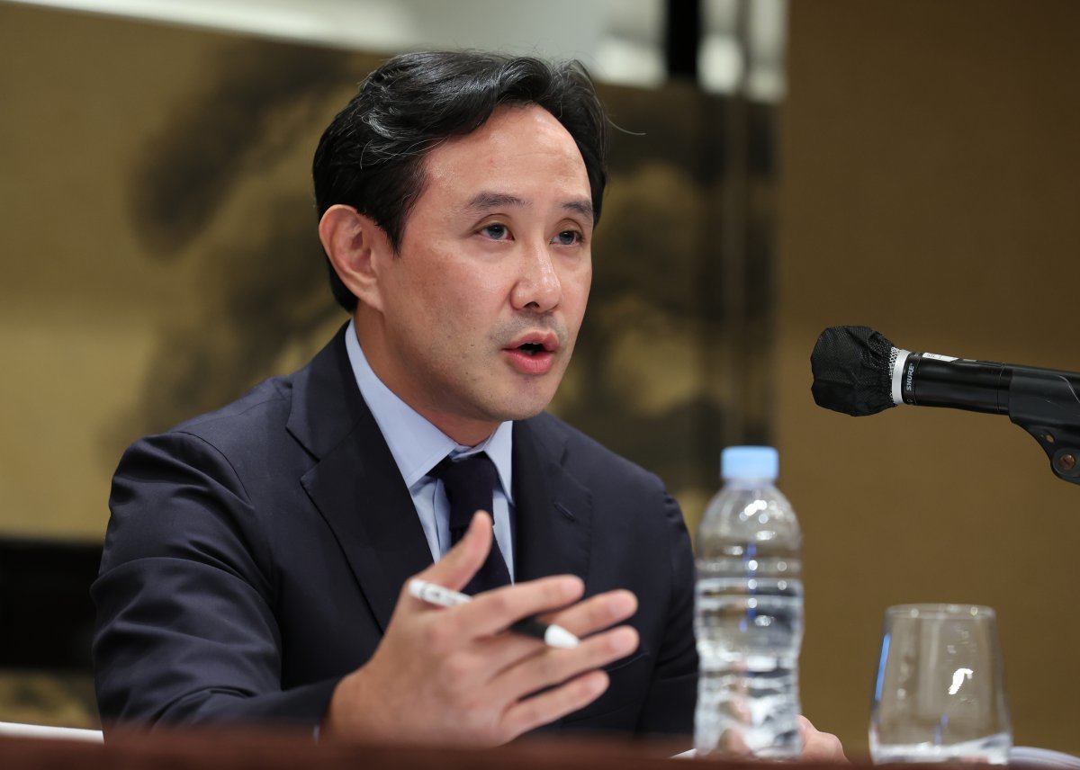 최윤범 고려아연 회장이 2일 서울 용산구 그랜드하얏트호텔에서 열린 고려아연 자사주 매입 계획 등 경영권 방어 방안에 대한 기자회견에서 취재진의 질문에 답하고 있다. 뉴시스