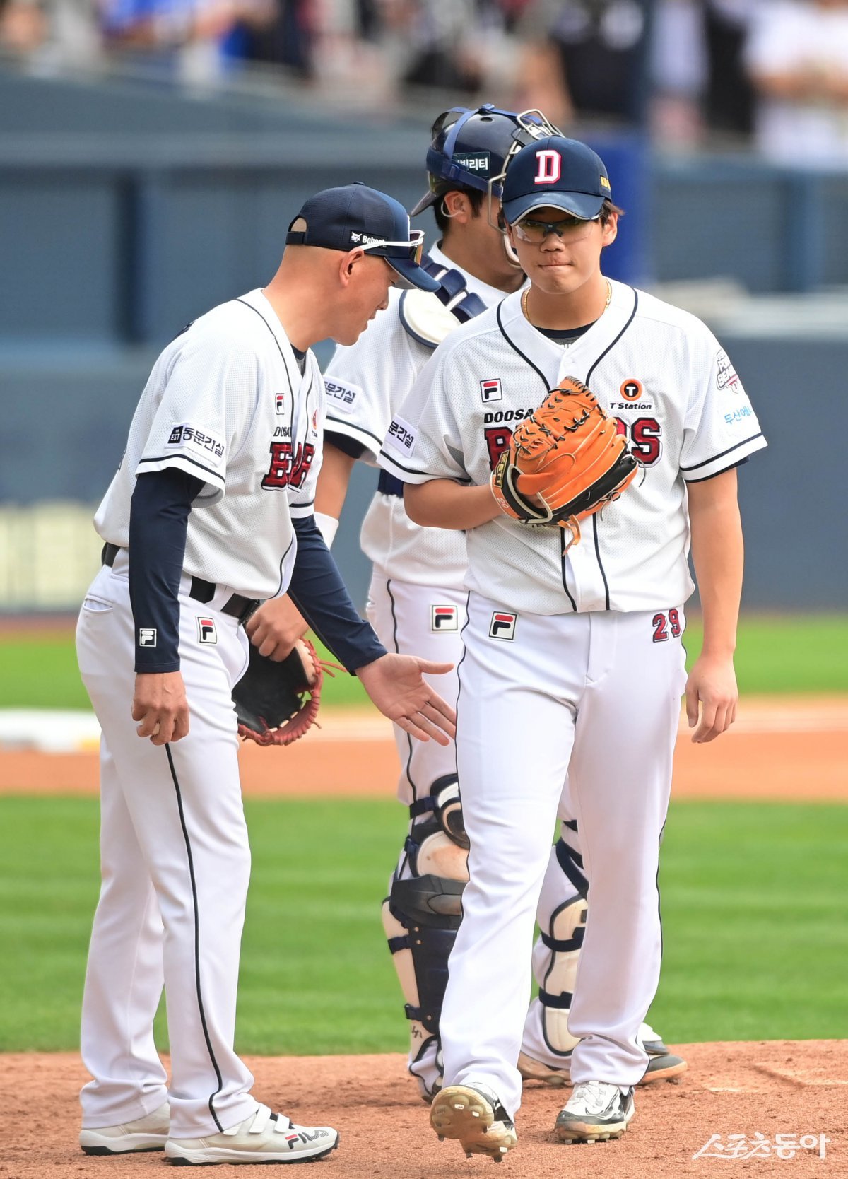 3일 서울 잠실야구장에서 열린 ‘2024 신한 SOL 뱅크 KBO리그 포스트시즌’ KT 위즈와 두산 베어스의 와일드카드 결정전 2차전 경기에서 6회초 2사 1루 상황에서 두산 이병헌이 마운드를 내려오고 있다. 잠실 | 주현희 기자 teth1147@donga.com