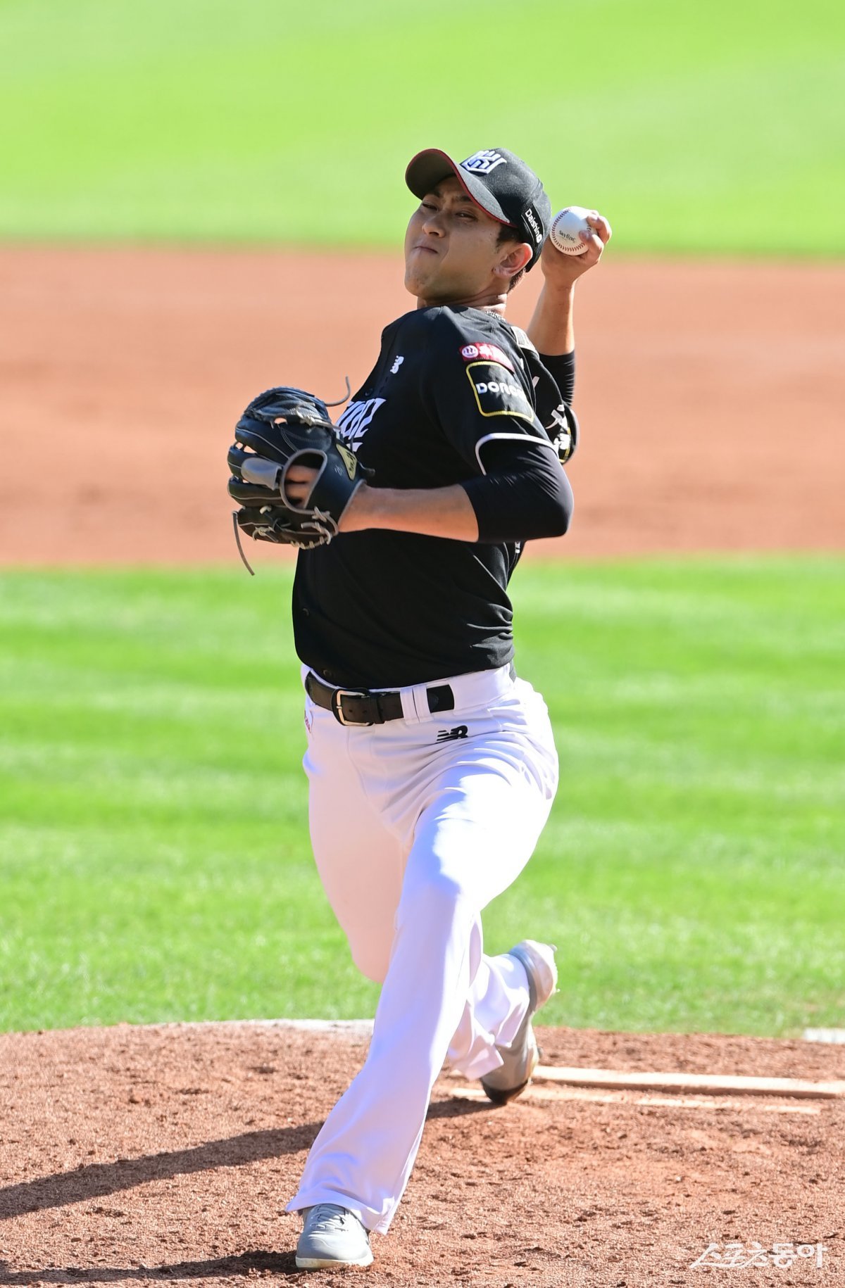5일 서울 잠실야구장에서 열린 ‘2024 신한 SOL 뱅크 KBO리그 포스트시즌’ KT 위즈와 LG 트윈스의 준플레이오프 1차전 경기에서 5회말 KT 김민수가 교체로 마운드에 올라 역투하고 있다. 잠실 | 주현희 기자 teth1147@donga.com