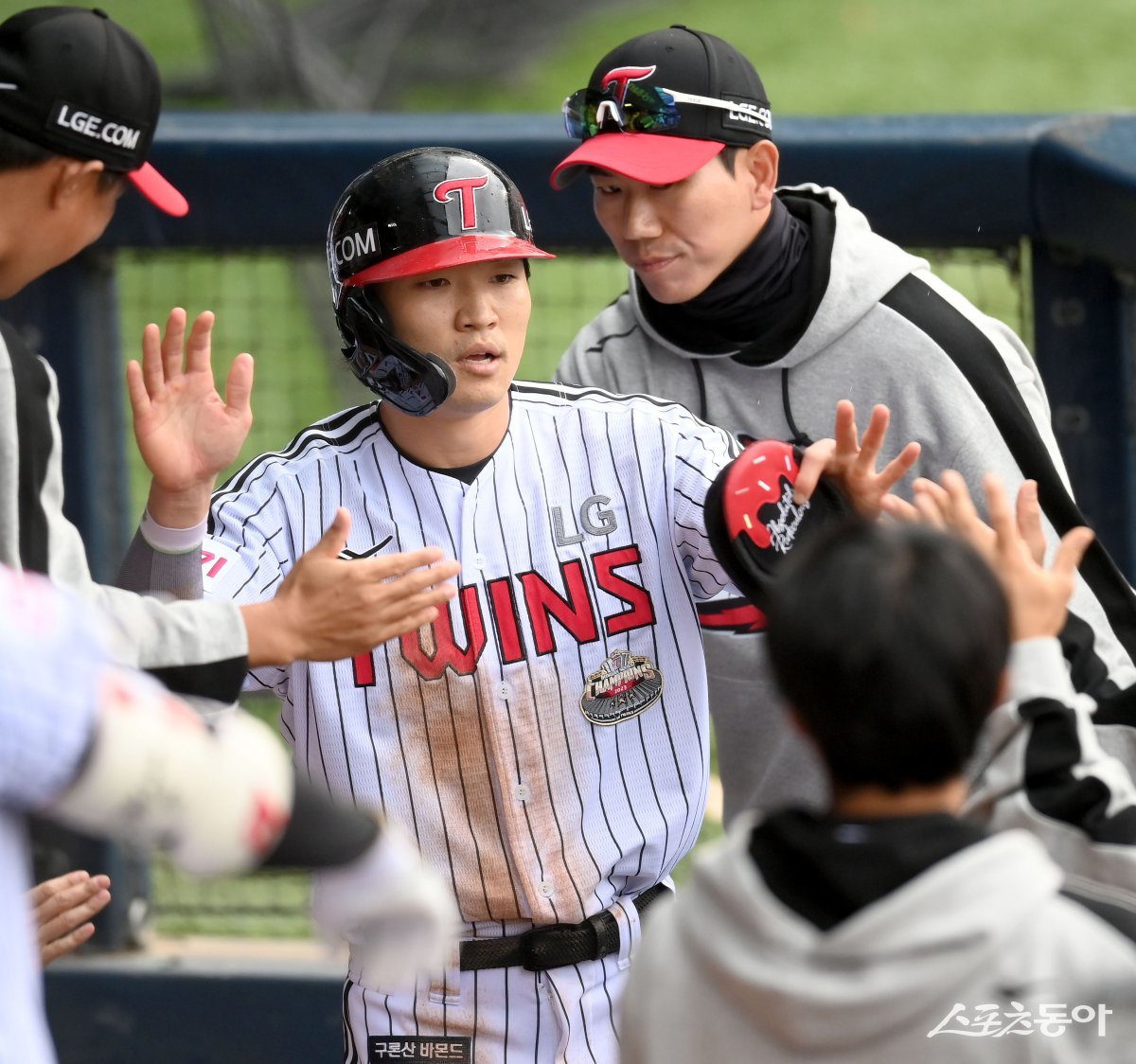 6일 서울 잠실야구장에서 ‘2024 신한은행 SOL뱅크 KBO리그’ KT 위즈와 LG 트윈스의 포스트시즌 준플레이오프 2차전 경기가 열렸다. 3회말 무사 2,3루 LG 희생타 때 득점한 박해민이 하이파이브 하고 있다. 잠실|김종원 기자 won@donga.com