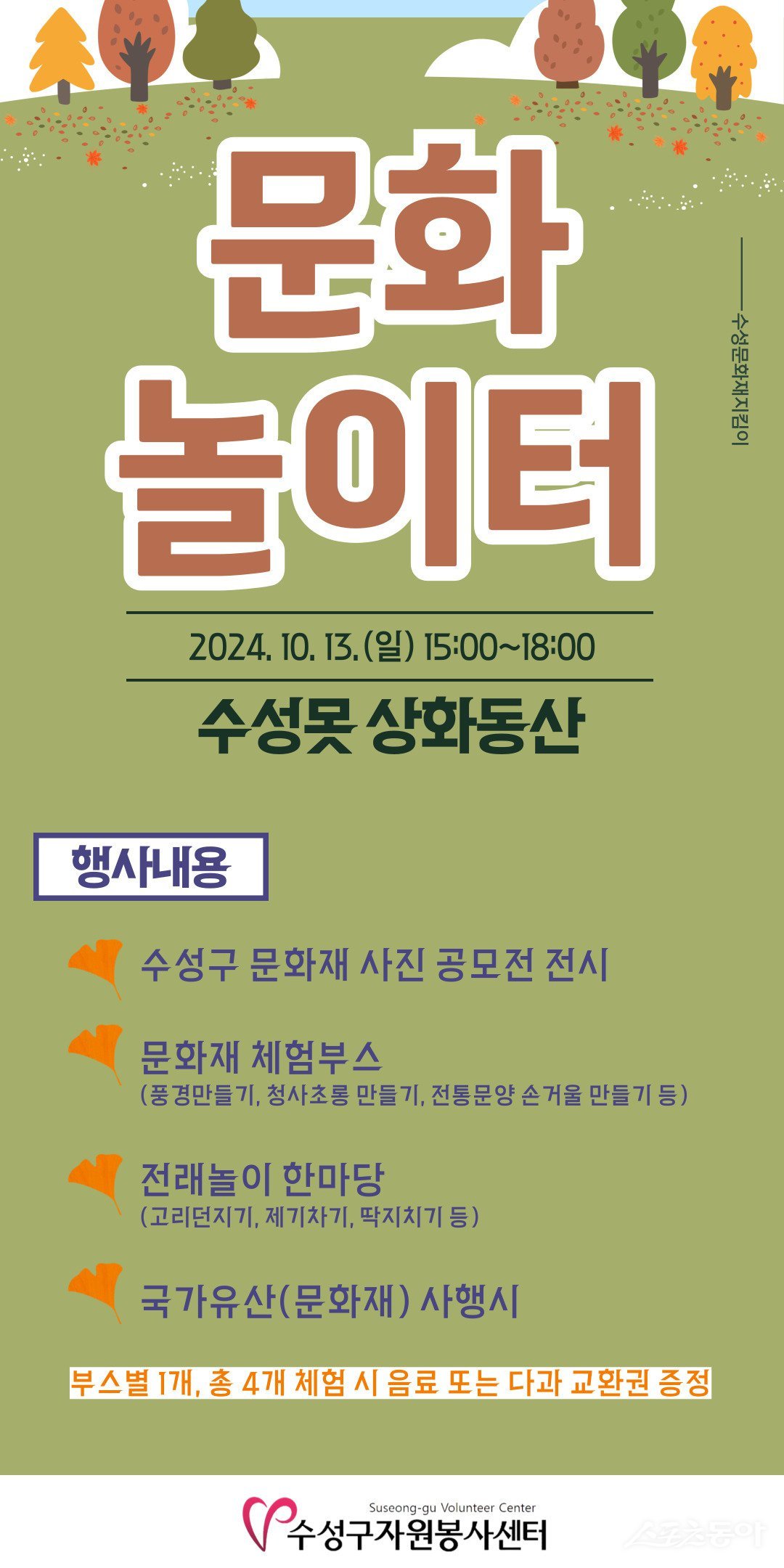 대구 수성구자원봉사센터 소속 수성문화재지킴이는 오는 13일 수성못 상화동산에서 제3회 문화놀이터를 개최한다고 7일 밝혔다.