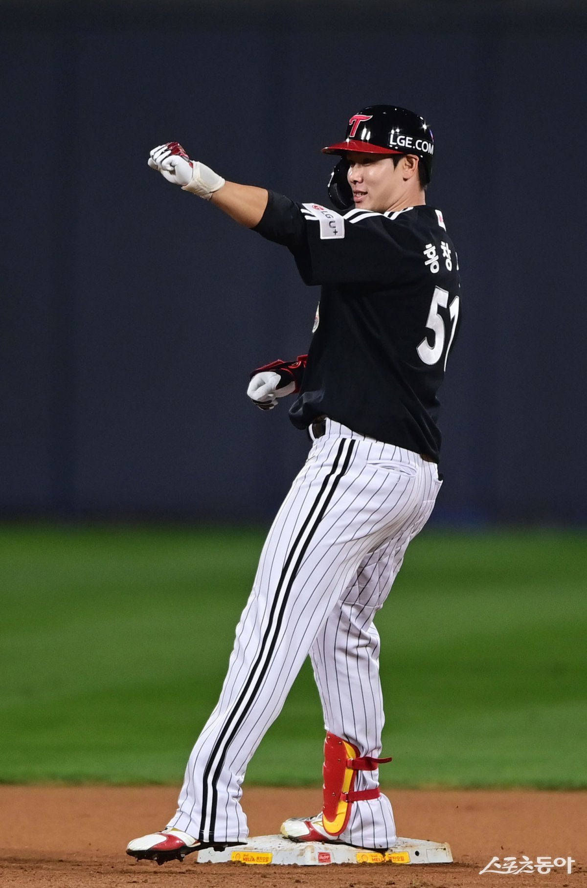 8일 수원KT위즈파크에서 열린 ‘2024 신한 SOL 뱅크 KBO리그’ 와 KT 위즈의 준플레이오프 3차전 경기에서 3회초 1사 3루 LG 홍창기가 1타점 우전 2루타를 친 후 세리머니를 하고 있다. 수원 | 주현희 기자 teth1147@donga.com