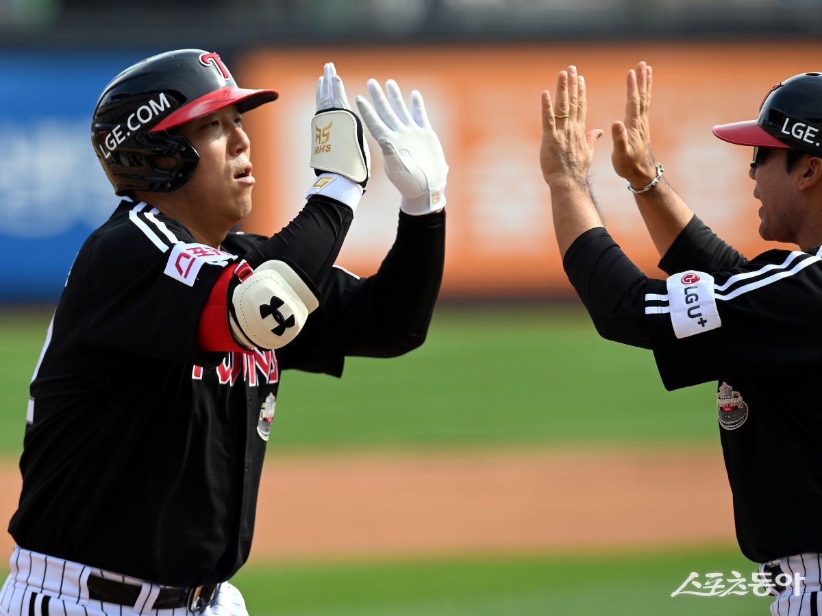 9일 경기도 수원 KT위즈파크에서 ‘2024 신한 SOL 뱅크 KBO리그’ KT 위즈와 LG 트윈스의 준PO 4차전 경기가 열렸다. 2회초 2사에서 LG 김현수가 솔포 홈런을 쏘아 올린 후 그라운드를 돌며 코치의 환영을 받고 있다. 수원 | 김민성 기자 marineboy@donga.com