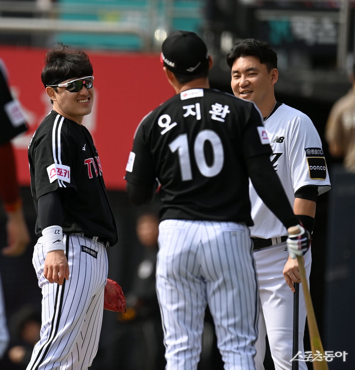 9일 수원KT위즈파크에서 ‘2024 신한은행 SOL뱅크 KBO리그’ LG 트윈스와 KT 위즈의 포스트시즌 준플레이오프 4차전 경기가 열렸다. 경기 전 LG 박동원과 KT 장성우가 이야기를 하고 있다. 수원|김종원 기자 won@donga.com