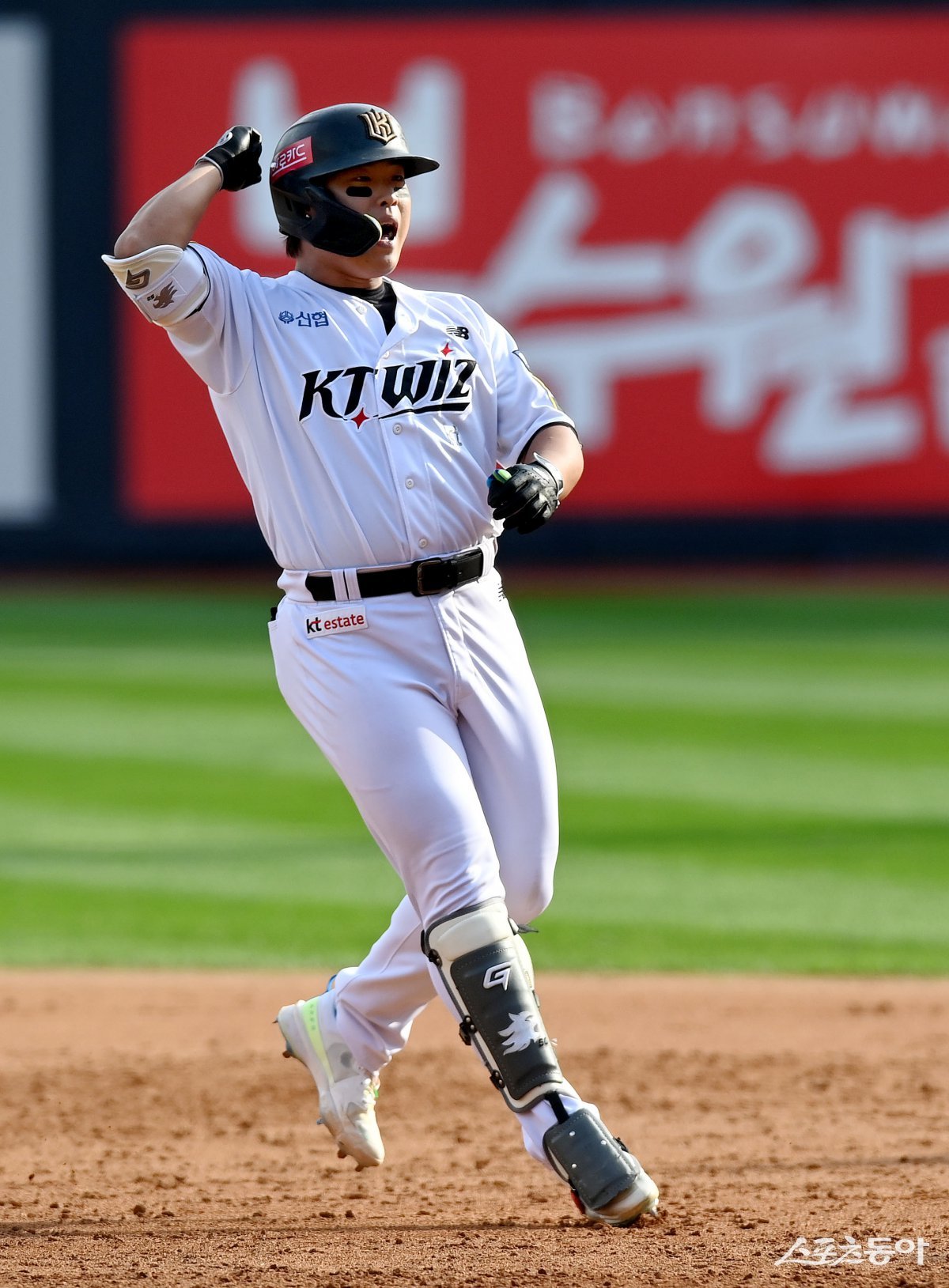 9일 경기도 수원 KT위즈파크에서 ‘2024 신한 SOL 뱅크 KBO리그’ KT 위즈와 LG 트윈스의 준PO 4차전 경기가 열렸다. 5회말 무사에서 KT 강백호가 솔로 홈런을 쏘아 올린 후 환호하고 있다. 수원 | 김민성 기자 marineboy@donga.com