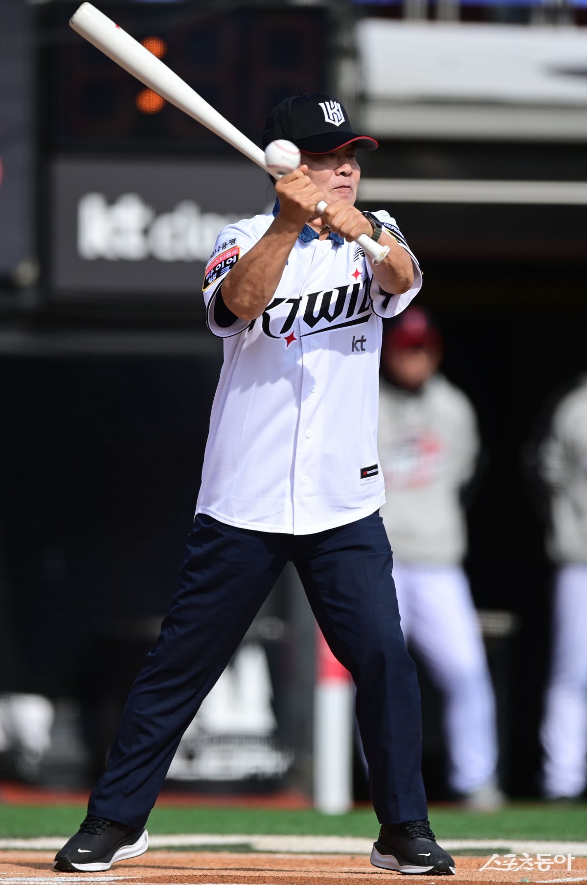9일 수원KT위즈파크에서 열린 ‘2024 신한 SOL 뱅크 KBO리그’ 와 KT 위즈의 준플레이오프 4차전 경기에 앞서 이재식 수원시의회 의장이 시타를 하고 있다. 수원 | 주현희 기자 teth1147@donga.com