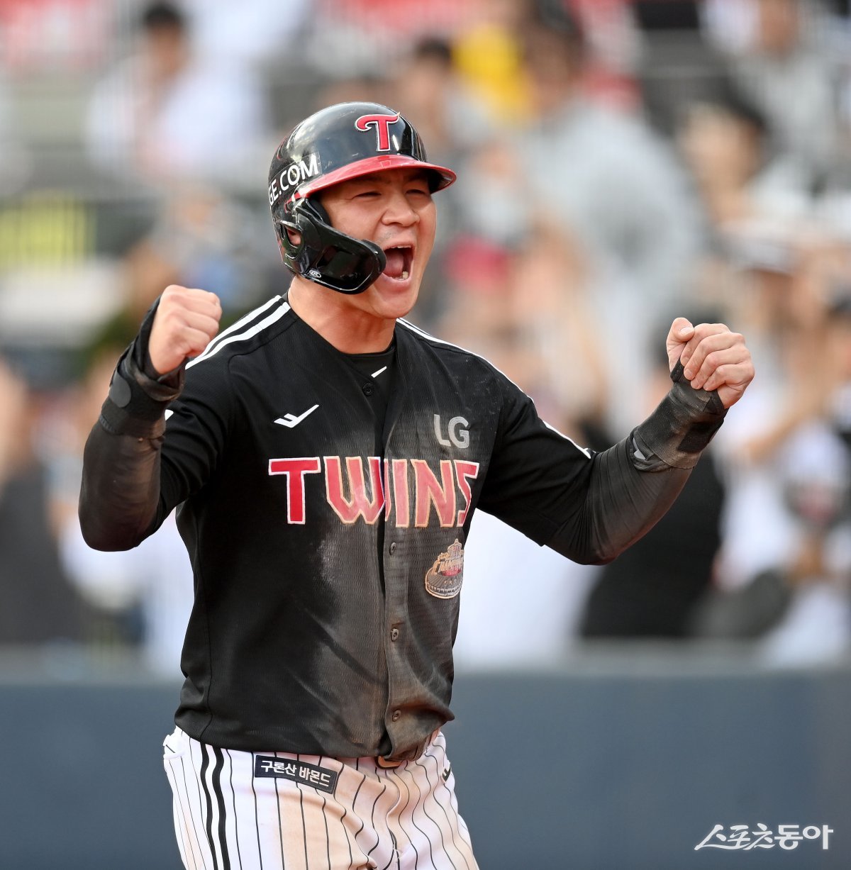 9일 수원KT위즈파크에서 ‘2024 신한은행 SOL뱅크 KBO리그’ LG 트윈스와 KT 위즈의 포스트시즌 준플레이오프 4차전 경기가 열렸다. 8회초 1사 2루 LG 김현수 안타 때 동점 득점에 성공한 오지환이 환호하고 있다. 수원|김종원 기자 won@donga.com