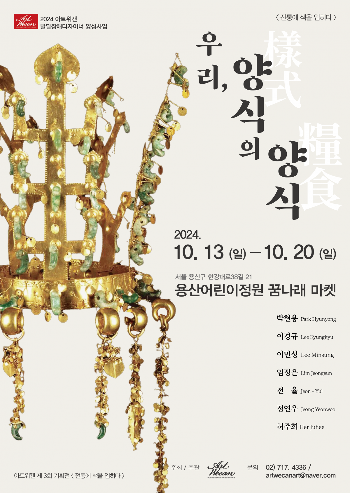 (사)한국발달장애인문화예술협회 아트위캔 (이하 아트위캔, 대표 왕소영)은 10월 13일(일)~20일(일) 용산 어린이정원 내에 있는 꿈나래마켓 전시실과 그 일대에서 ‘2024 아트위캔 발달장애디자이너 양성사업’ 제3회 기획전 <우리, 양식의 양식>을 개최한다.