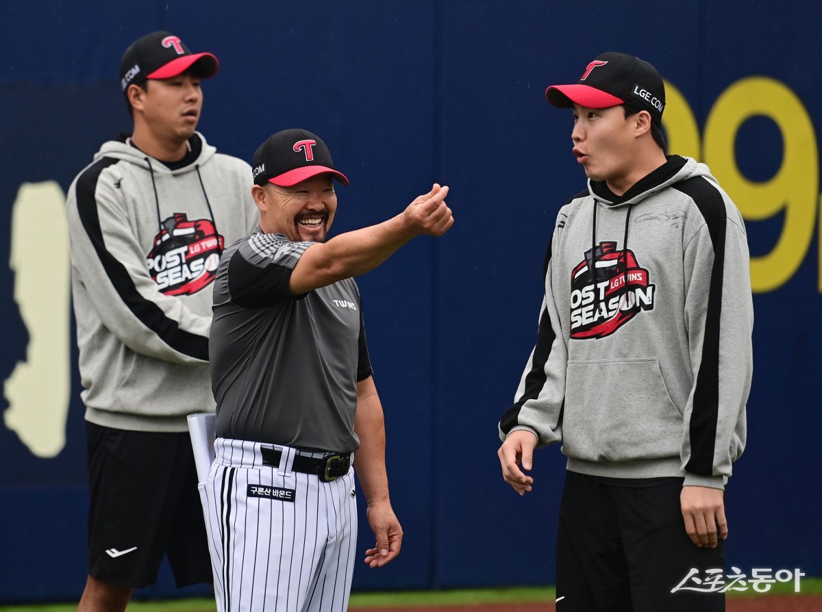 13일 대구삼성라이온즈파크에서 열린 ‘2024 신한 SOL 뱅크 KBO리그’ LG 트윈스와 삼성 라이온즈의 플레이오프 2차전 경기에 앞서 LG 김용일 코치가 선수들과 이야기를 하고 있다. 대구 | 주현희 기자 teth1147@donga.com