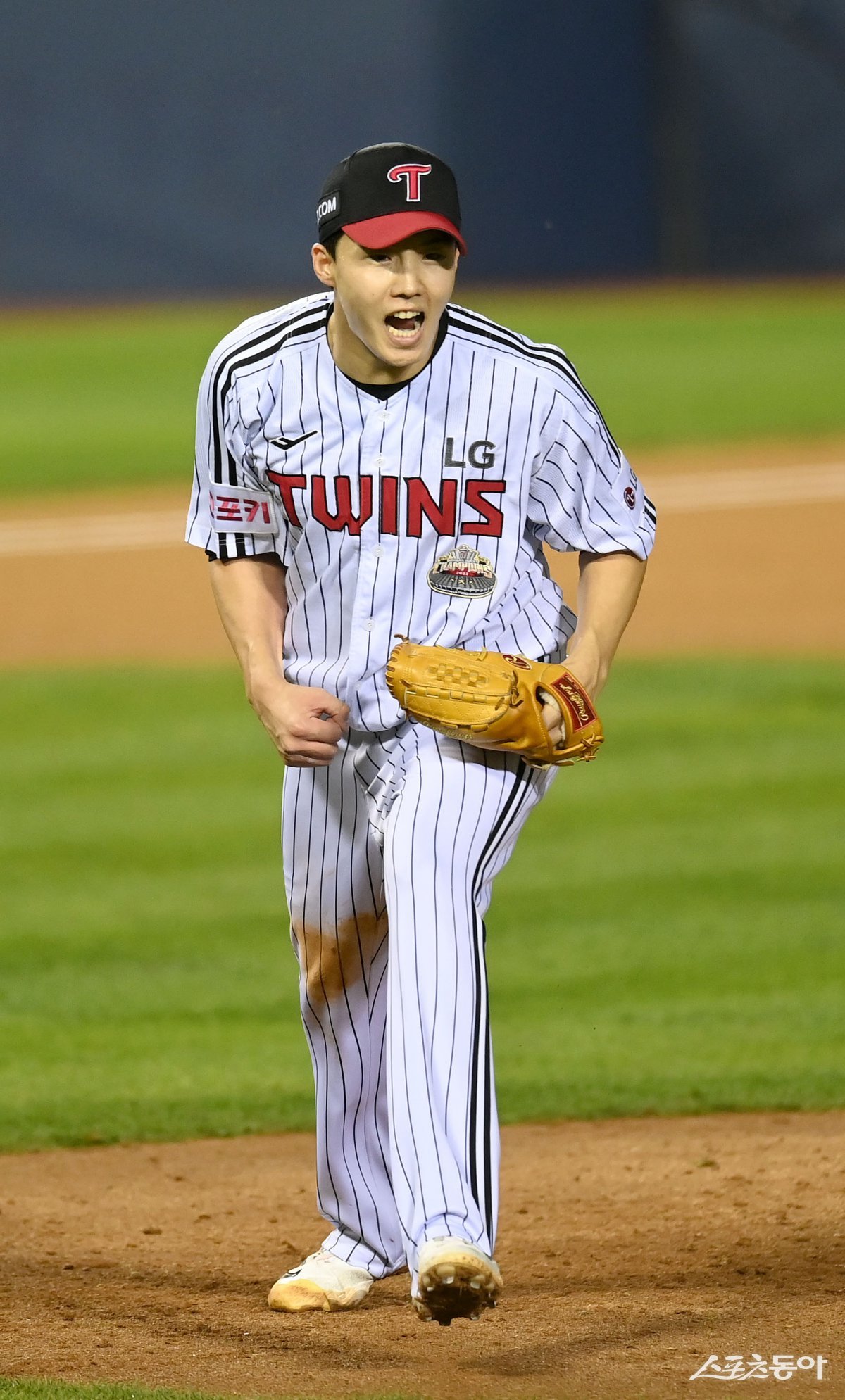 17일 서울 잠실야구장에서 ‘2024 신한은행 SOL뱅크 KBO리그’ 삼성 라이온즈와 LG 트윈스의 포스트시즌 플레이오프 3차전 경기가 열렸다. 선발 투수로 등판한 LG 임찬규가 4회초 2사 1,3루 위기상황을 삼진으로 막은 후 환호하고 있다. 잠실|김종원 기자 won@donga.com