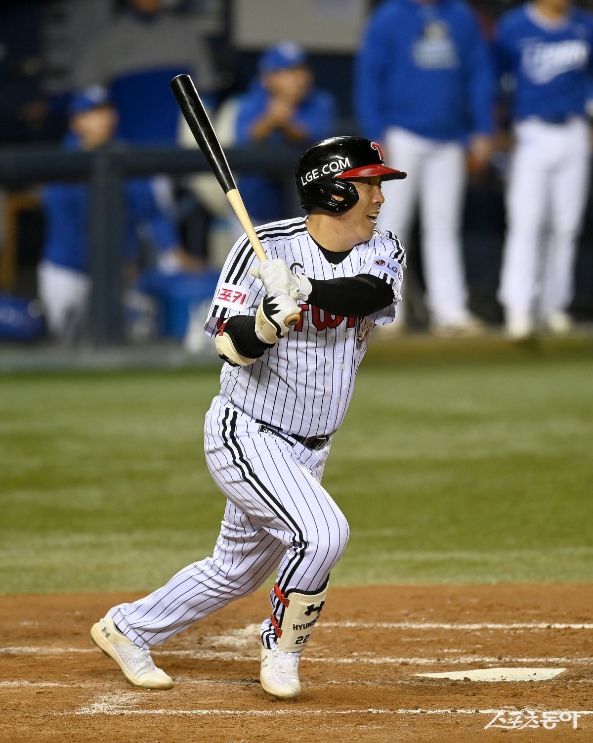 17일 서울 잠실야구장에서 ‘2024 신한은행 SOL뱅크 KBO리그’ 삼성 라이온즈와 LG 트윈스의 포스트시즌 플레이오프 3차전 경기가 열렸다. 4회말 1사 LG 김현수가 우전 안타를 치고 있다. 잠실|김종원 기자 won@donga.com