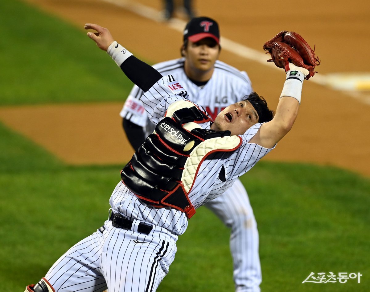 17일 서울 잠실야구장에서 ‘2024 신한 SOL 뱅크 KBO리그’ LG 트윈스와 삼성 라이온즈의 PO 3차전 경기가 열렸다. 7회초 1사에서 LG 박동원이 파울 타구를 잡아내고 있다. 잠실 | 김민성 기자 marineboy@donga.com