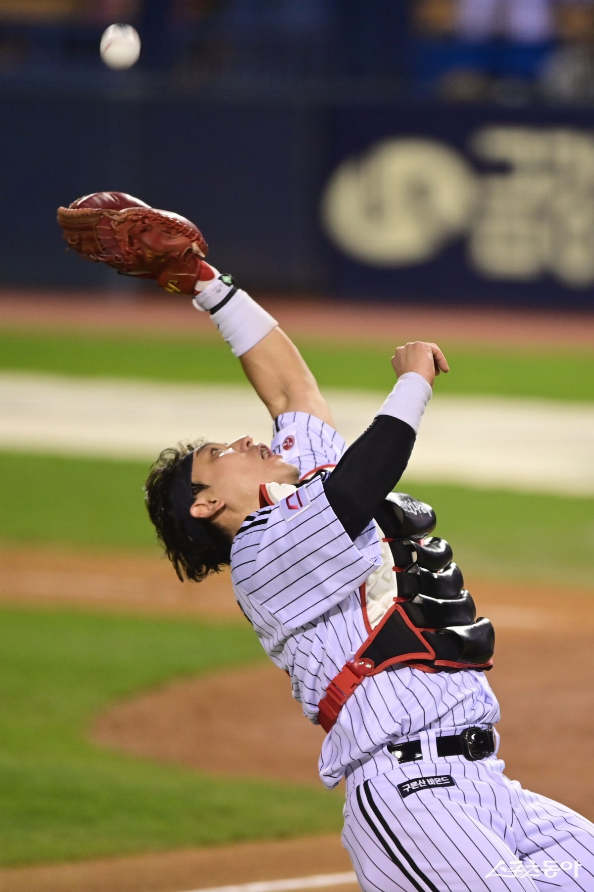17일 서울 잠실야구장에서 열린 ‘2024 신한 SOL 뱅크 KBO리그’ 삼성 라이온즈와 LG 트윈스의 플레이오프 3차전 경기에서 7회초 1사 삼성의 뜬공을 LG 박동원이 잡고 있다. 잠실 | 주현희 기자 teth1147@donga.com