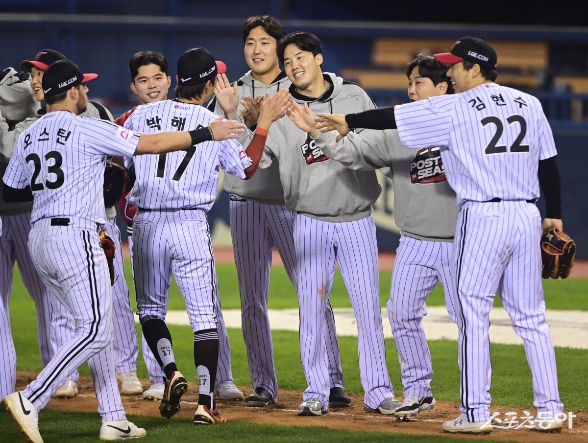 17일 서울 잠실야구장에서 열린 ‘2024 신한 SOL 뱅크 KBO리그’ 삼성 라이온즈와 LG 트윈스의 플레이오프 3차전 경기에서 1-0으로 승리한 LG 선수들이 기쁨을 나누고 있다. 잠실 | 주현희 기자 teth1147@donga.com