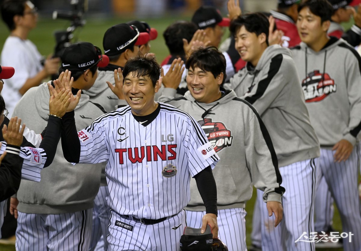 17일 서울 잠실야구장에서 ‘2024 신한은행 SOL뱅크 KBO리그’ 삼성 라이온즈와 LG 트윈스의 포스트시즌 플레이오프 3차전 경기가 열렸다. 1-0 승리를 거둔 후 LG 김현수가 하이파이브 하고 있다. 잠실|김종원 기자 won@donga.com