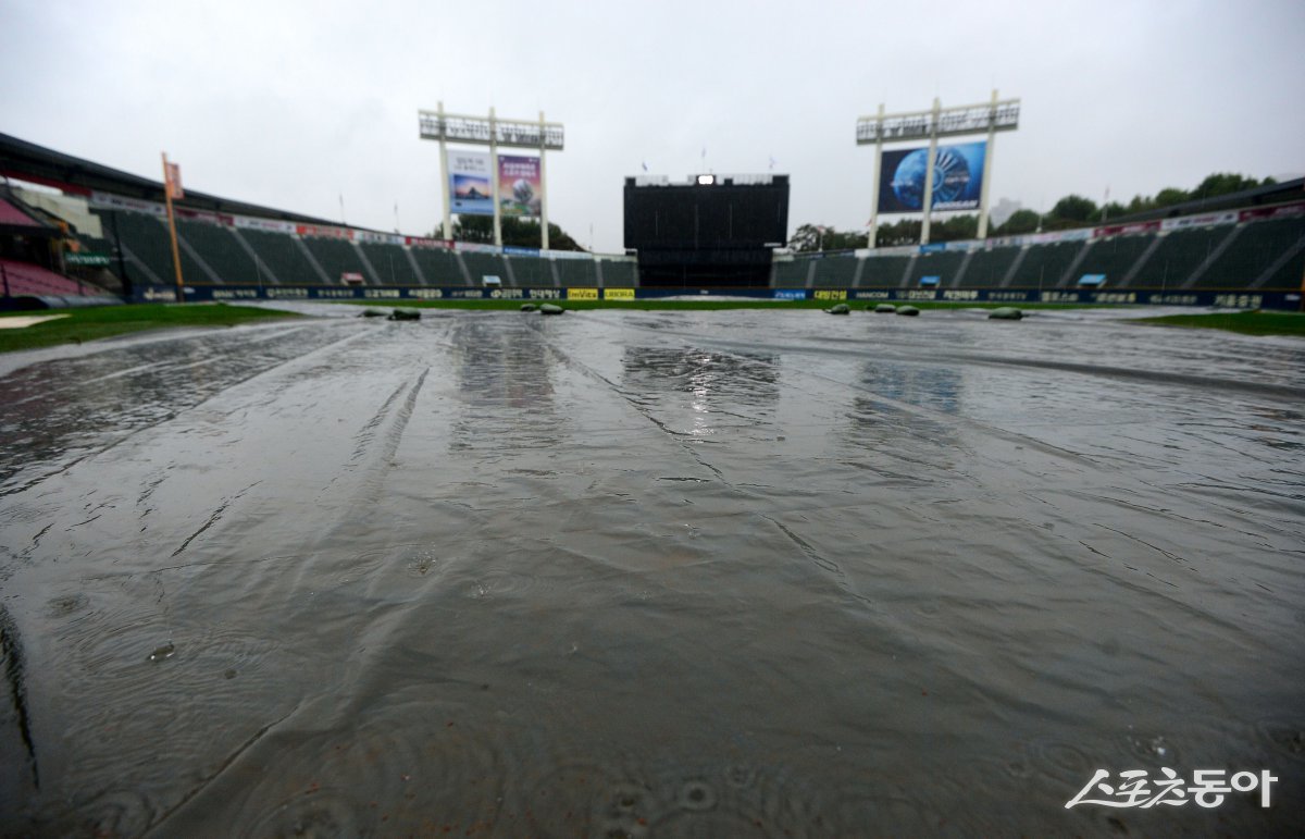 18일 서울 잠실야구장에서 열릴 예정인 ‘2024 신한 SOL 뱅크 KBO리그’ LG 트윈스와 삼성 라이온즈의 PO 4차전 경기를 앞두고 야구장에 비가 내리고 있다. 잠실 | 김민성 기자 marineboy@donga.com