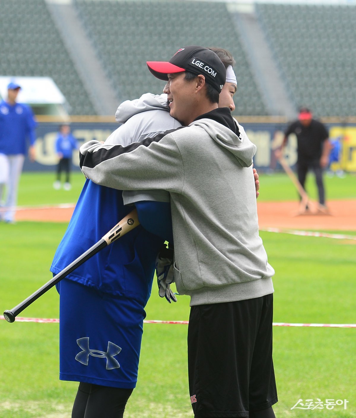 19일 서울 잠실야구장에서 열린 ‘2024 신한 SOL 뱅크 KBO리그’ 삼성 라이온즈와 LG 트윈스의 플레이오프 4차전 경기에 앞서 삼성 박병호, LG 정수성 코치가 포옹을 하고 있다.